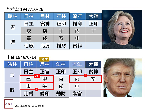巧合的是希拉蕊與川普兩人的日主五行皆為土,希拉蕊為戊土(陽),川普為己土(陰),從氣質上好像可以大略分出來陽土與陰土的差別呢!