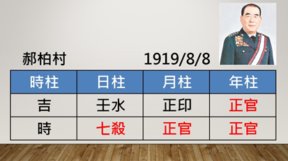 其前三柱八字命盤中,天干【偏財生七殺】,執行力超高,【七殺】也是官星,官星旺,故能任領導。地支【比肩剋偏財】,治軍嚴謹。【正印】安坐地支,故能得貴人照拂。